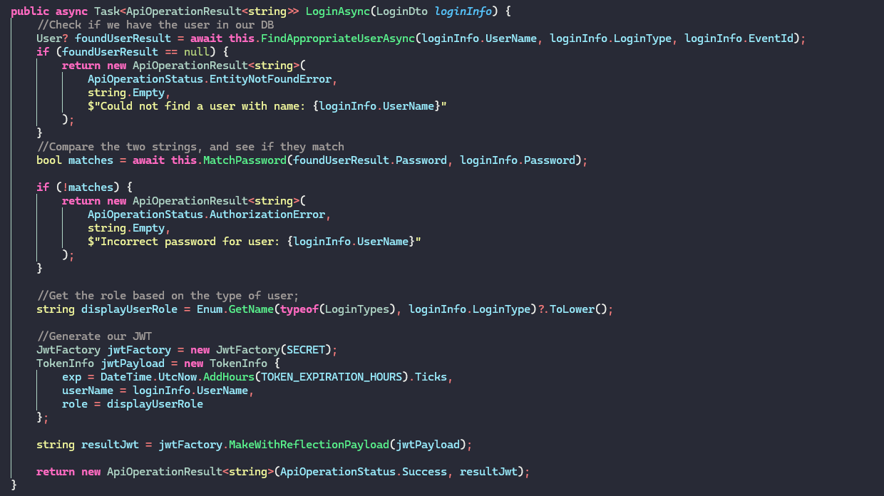 We are going to make a function to log in a user to our app, usually, the function would take in just the userName, password and it would return an actual instance of the User class with data from our database, it would like something like this: